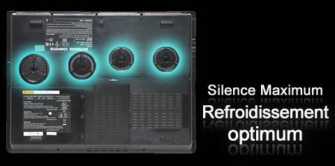 Coté passif, trois radiateurs surdimensionnés associés à de larges évents permettent de dissiper les calories du processeur et de la carte graphique. Coté actif, 4 ventilateurs basse vitesse très silencieux rentrent en action de façon indépendante dès que la température interne le justifie. Chaque ventilateur refroidit une zone précise de la machine (processeur et chipsets, compartiment des disques durs, compartiment mémoires, carte graphique). Au final, plutôt qu'un seul et unique ventilateur extracteur très bruyant, ce sont 4 ventilateurs surdimensionnés et tournant à faible vitesse qui permettent d'assurer un refroidissement optimum de la machine, même dans les conditions les plus extrêmes.